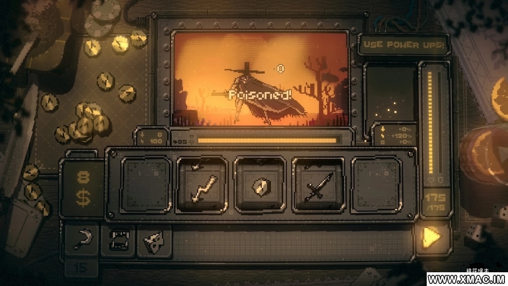 这是一款融合复古风格与迷你肉鸽玩法的老虎机游戏。握紧匕首——开始旋转轮盘吧!
