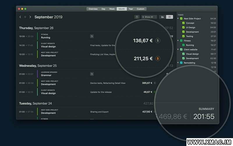 设置您的任务每小时费率,让Timemator计算您的收入。最后,您可以仅导出报告并将其直接发送给您的客户。