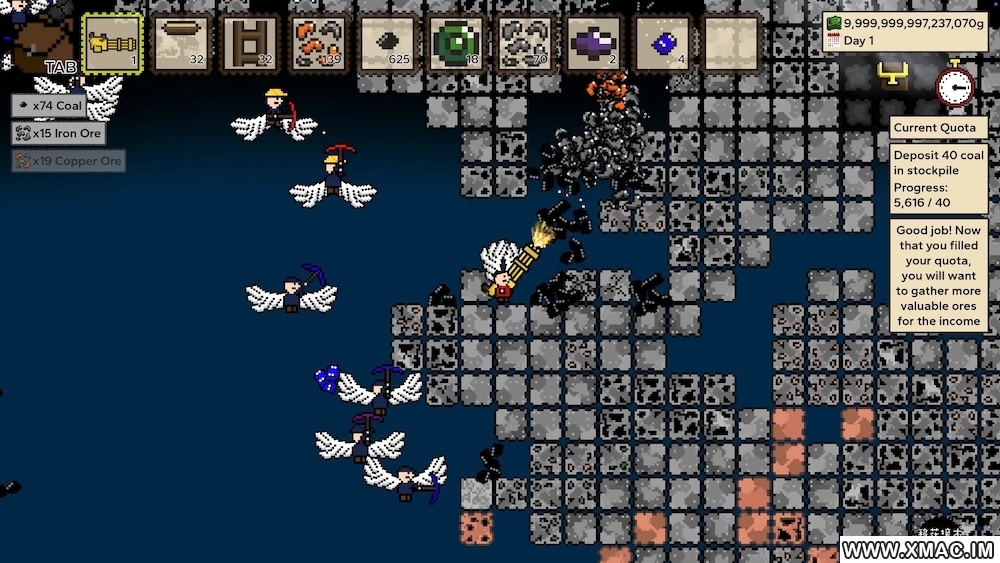 你为邪恶的采矿组织工作,开始时只有一把劣质镐,必须完成每天的煤炭配额,培养和雇用员工以实现目标,每天都是一场尽可能多深地挖矿,有效地管理您的设备和人员,满足不断增长的配额并最大化每天的利润。
